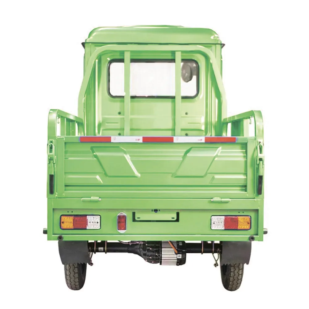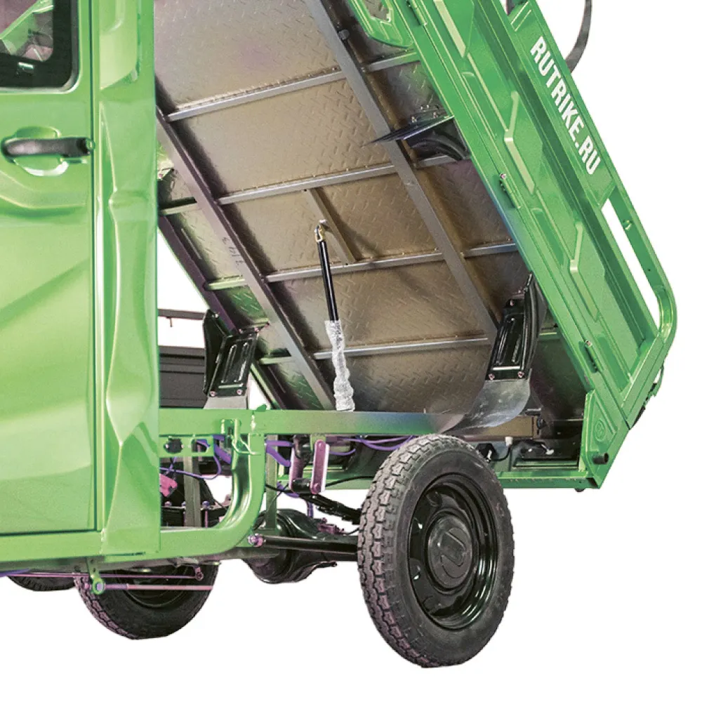 Модель оснащена современным тяговым бесщеточным новым мощным мотором с параметрами 1000 Вт. Такая начинка улучшает скоростные характеристики техники. Электротрицикл быстро развивает скорость до 25 км/час. Откидные борта кузова позволяют легко выгружать крупногабаритный груз. Герметично закрытая кабина допускает езду при любых погодных условиях, открывается с двух сторон.
