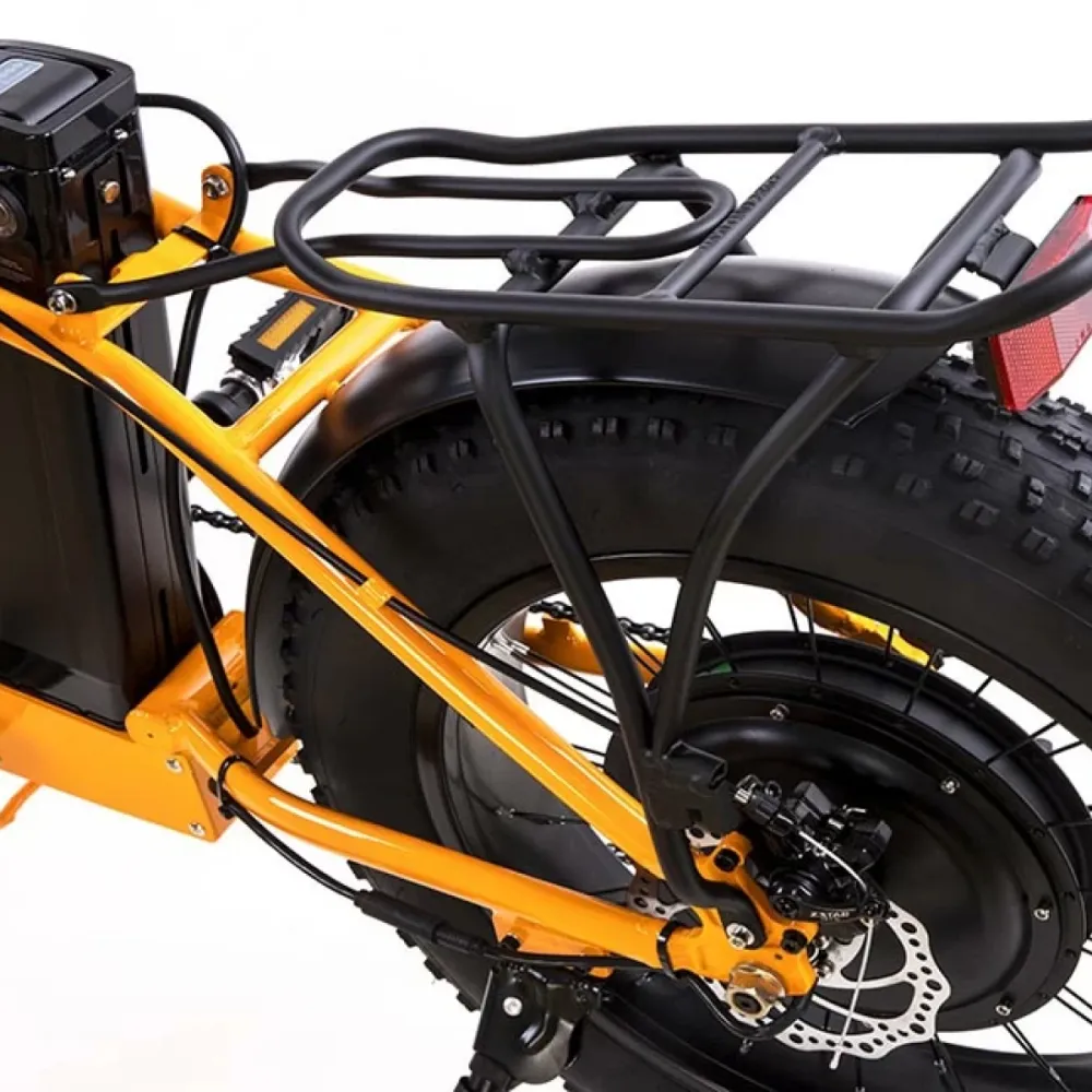 Модель грузоподъемностью 140 кг рассчитана на 1 ездока. Наличие багажника допускает езду с пассажиром небольшого веса. При мощности двигателя 500 Вт электровелосипед способен развивать скорость до 39 км/час, максимальный запас хода составляет 80 км. При необходимости райдер может чередовать электро режим с педальным. Батарея – емкая, с параметрами 48 В и 12,5 А*ч разморожена за подседельной трубкой в специальном блоке. Не мешает райдеру при продолжительной езде.