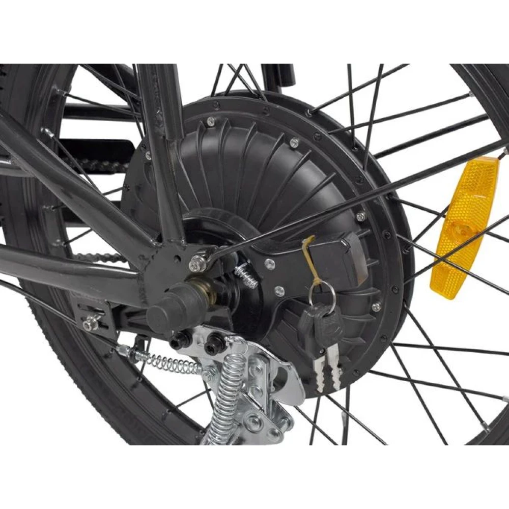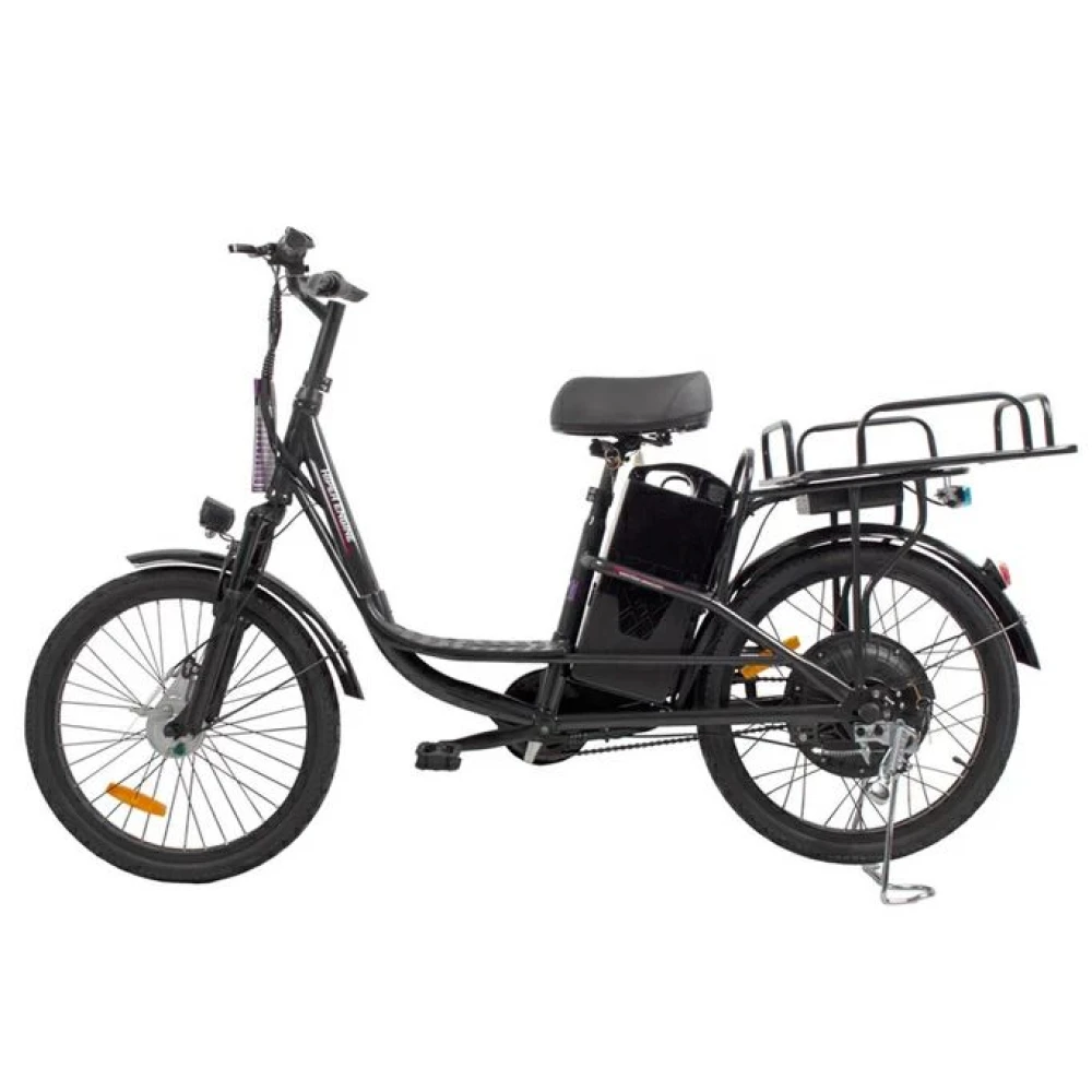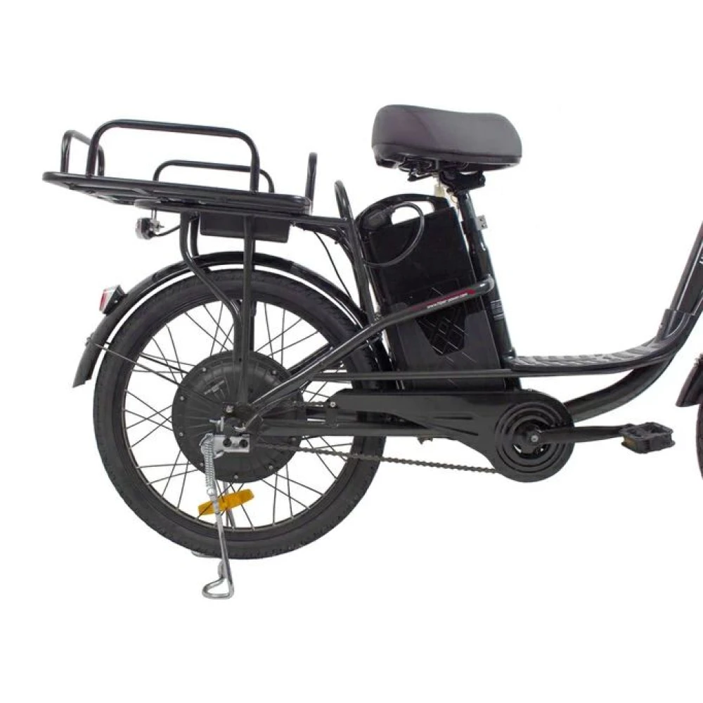 При максимальной грузоподъемности 130 кг и параметрах электродвижка 350 Вт скоростные параметры достигают 25 км/час, а максимальный запас хода составляет 45 км. Батарея емкостью 12 А*ч размещена за подседельной трубке в специальном защитном блоке. АКБ быстро заряжается, относится к категории быстро съемных элементов.