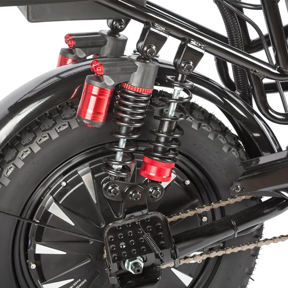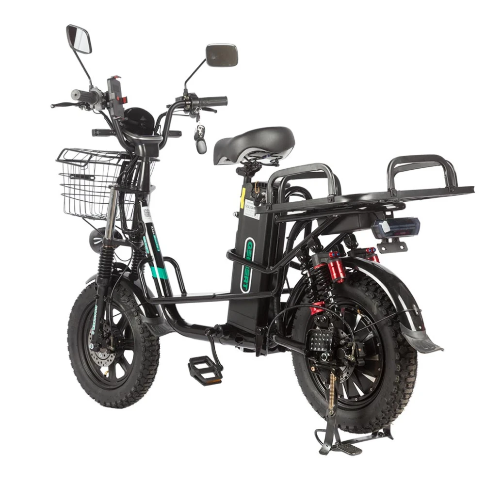Электровелосипед Eltreco Gelbert Khan Monster 2 – это современное средство передвижения, сочетающее в себе продуманную конструкцию, передовые технологии и стильный дизайн для уверенных городских и пригородных поездок.Модель оснащена передним и задним амортизаторами, которые эффективно смягчают неровности дороги, обеспечивая плавность хода и комфорт даже на пересеченной местности. При заявленном максимальном пробеге до 100 км на одном заряде этот велосипед подходит для длительных поездок – конечно, реальные показатели зависят от веса райдера, рельефа местности, погодных условий и температуры окружающей среды.Безопасность обеспечивается за счет дисковых гидравлических тормозов, которые гарантируют надежное и своевременное торможение в любых ситуациях. Легкий вес в 57 кг позволяет легко маневрировать, а максимальная нагрузка до 150 кг делает модель универсальной для разных категорий пользователей.Двигатель мощностью 240 W, размещенный в задней части, обеспечивает эффективное ускорение и оптимальное распределение энергии, что способствует стабильной работе в условиях городской среды. Электровелосипед оборудован аккумулятором с емкостью 30 Ah и рабочим напряжением 60 V, что гарантирует долгий срок службы батареи и надежную работу даже на длинных маршрутах.Габариты в собранном состоянии – 1700×1150×800 мм – обеспечивают удобное расположение для водителя, а использование качественной стали в конструкции гарантирует долговечность и надежность всей системы. Дополнительное оснащение включает зеркала заднего вида, которые повышают безопасность, а встроенные передние и задние габаритные фары обеспечивают отличную видимость в условиях недостаточной освещенности.Стоит отметить, что данная модель не является складной, что подчеркивает ее прочную и стабильную конструкцию, рассчитанную на долгосрочную эксплуатацию. Электровелосипед Eltreco Gelbert Khan Monster 2 – это оптимальное решение для тех, кто ищет сочетание высоких технологий, надежности и комфорта в одном устройстве.